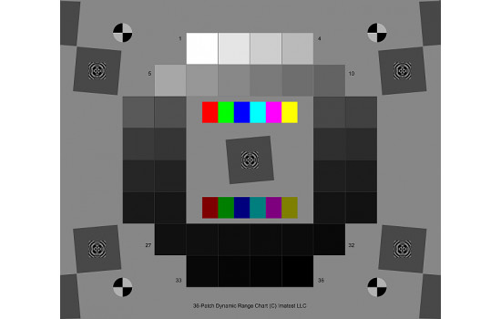 Ayrıca ortada eğimli kenarlar ve MTF ölçümü için 4: 1 kontrastlı köşeler içerir. Kenarlar, en iyi mürekkep püskürtmeli grafiklerden yaklaşık 3 kat daha iyi olan bir MTF50> = 16 döngü / mm'ye sahiptir. Kayıt işaretleri bölgelerin seçilmesini kolaylaştırır. Nötr gri arka plan, grafiğin otomatik pozlama kameralarında iyi pozlanmasını sağlamaya yardımcı olur (siyah arka planlı, bazen aşırı derecede pozlanmış grafiklerle karşılaştırıldığında).